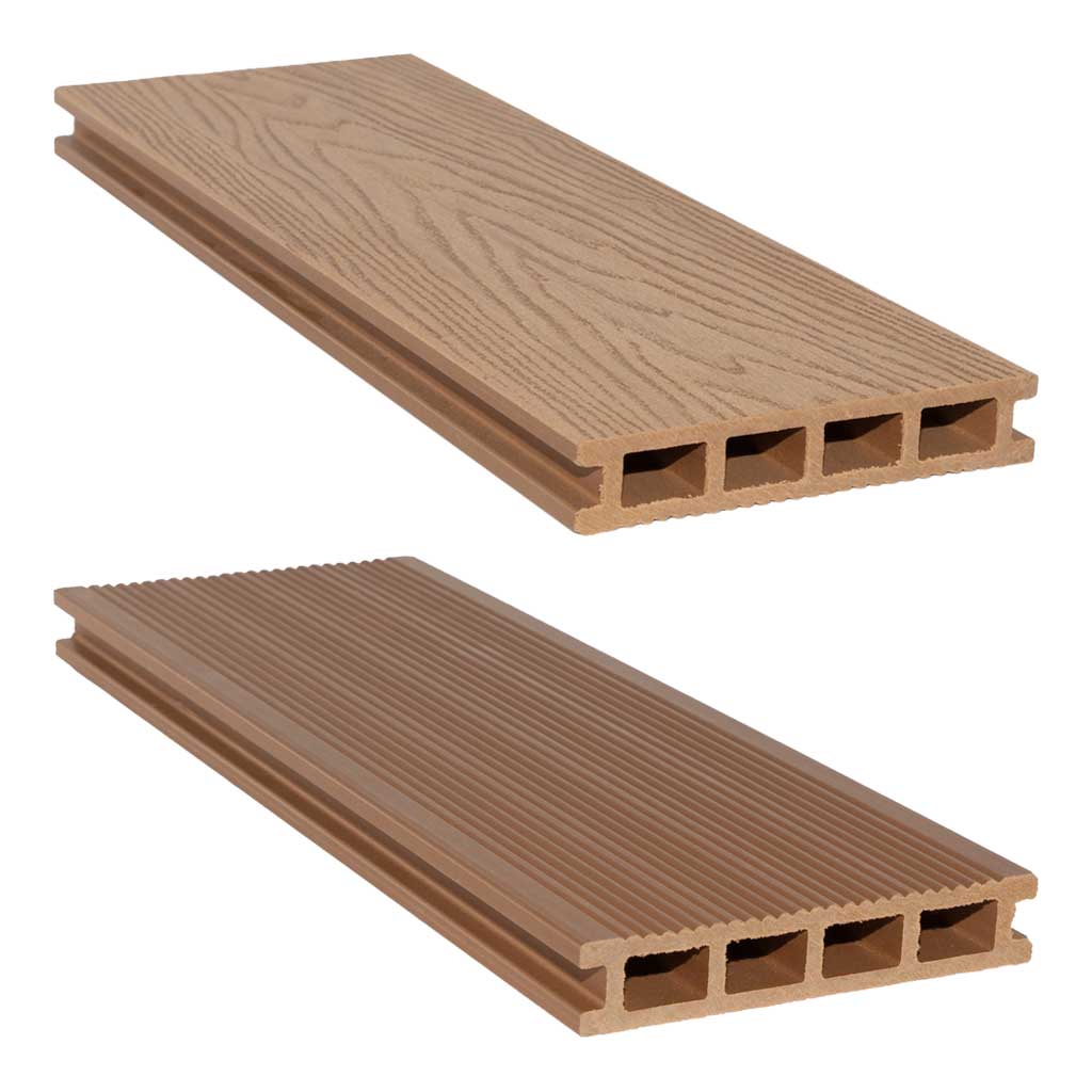 1. Двусторонняя террасная доска — изготовленная из древесины, обработанной двумя сторонами, что позволяет менять ее цвет и шаблон в зависимости от желания.